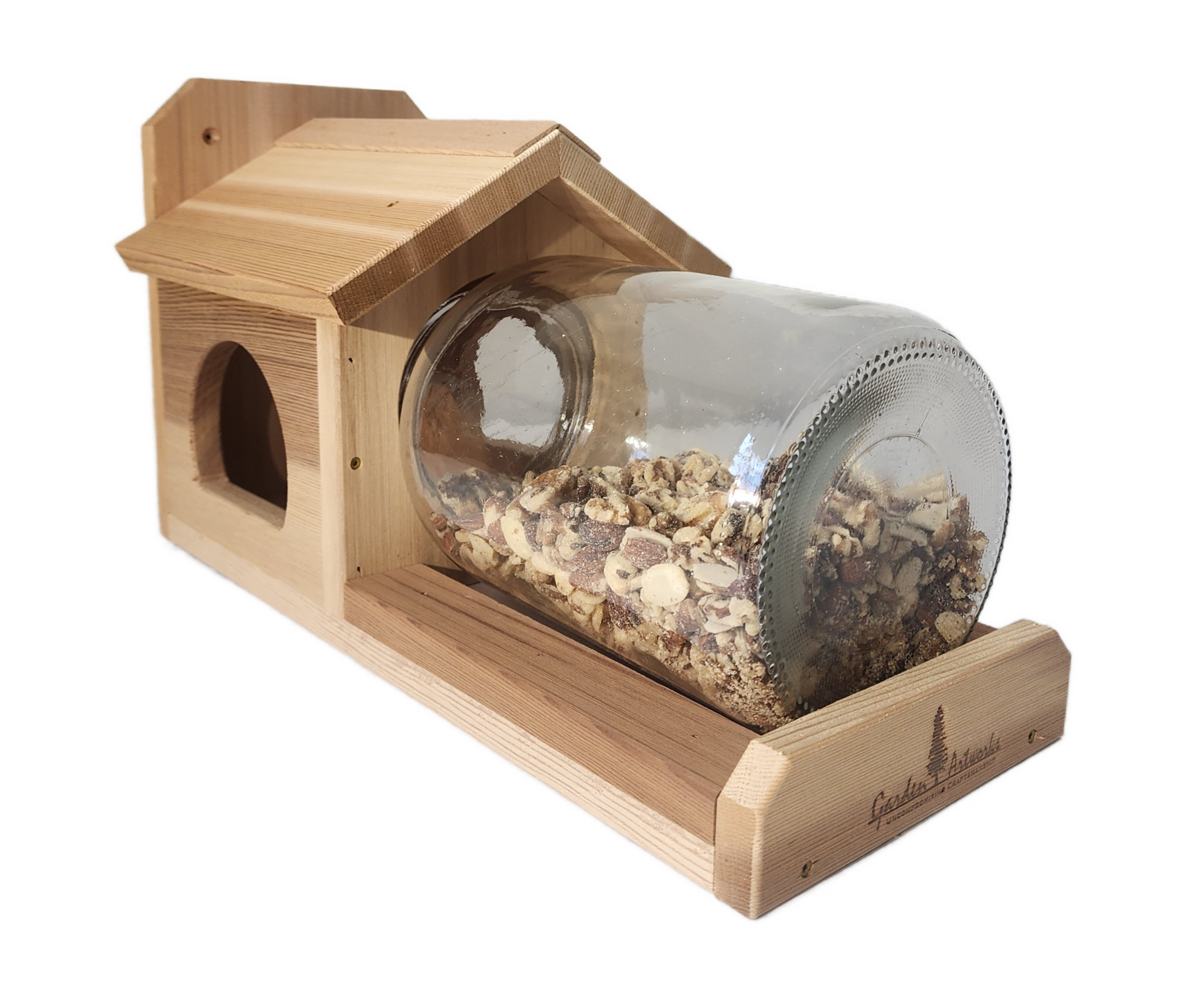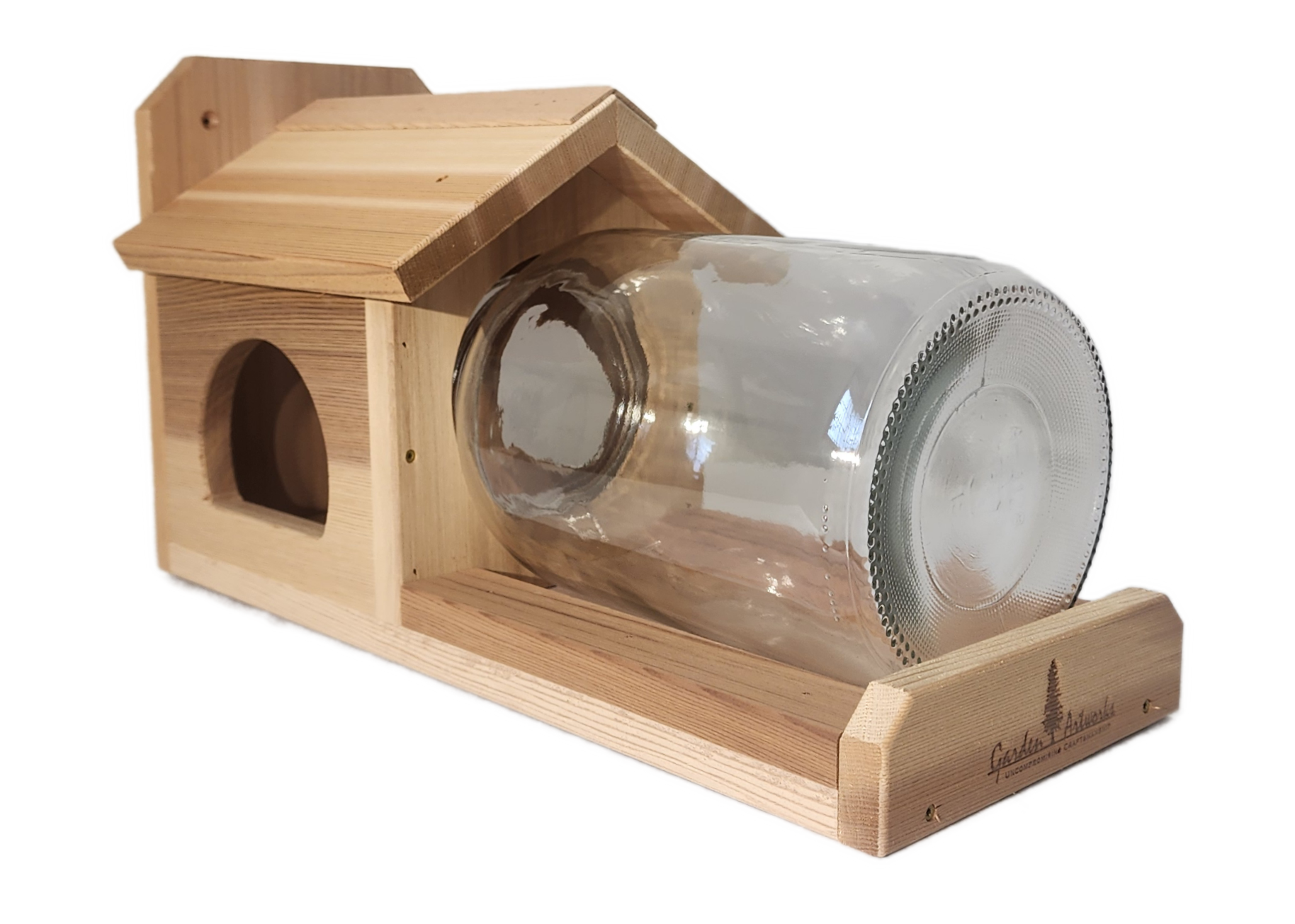 This squirrel jar feeder is perfect for keeping pesky squirrels away from your bird feeders! With an easy-to-remove one gallon jar, refilling is a breeze. Made of sturdy cedar wood and screw construction, this feeder is built to last. Its large entrance ensures that even the best feed squirrels can access the food. Enjoy a squirrel-free bird feeding experience with this feeder!